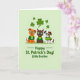 This card shows three cartoon-style puppies lined up side by side on a pale green background, their cheeks lifted in wide grins as they lean subtly toward one another like close friends in a photo. A tan pup wears a green sweater with a white shamrock on the chest, a chocolate-brown pup has a lime-green bandana at the neck, and a white-and-brown patched pup sports a green-and-yellow striped jumper, all topped off with oversized green-rimmed glasses that match. Above their heads, scattered shamrocks in different sizes drift across the top area, adding a festive sprinkle of ☘️. The pups’ bright eyes and slightly tilted heads create a tender, affectionate energy, as if they’re sharing a private joke together. Along the bottom, the message “Happy St. Patrick’s Day! Little Brother,” is set as a single line of green text centered beneath the trio. The green tones repeat through the clothing, glasses, and shamrocks, tying everything together with a soft, cheerful look 💚. The final touch is the cluster of floating shamrocks hovering above the puppies against the pale green field.