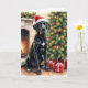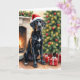 This card shows a cozy, festive Christmas scene featuring a large black Great Dane lying in front of a glowing fireplace. The fire casts a warm light over the room, enhancing the dog’s glossy black coat. To the left of the fireplace stands a beautifully decorated Christmas tree adorned with red and gold baubles. Beneath the tree are several neatly wrapped presents, red and gold, that complete the holiday atmosphere. The overall tone is warm, homely, and peaceful—perfectly capturing the essence of a cosy Christmas evening. Can easily be personalised
