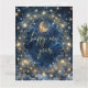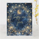 Una escena nocturna mística que presenta una luna creciente luminosa acunada por estrellas doradas y patrones celestes, sobre un fondo cósmico azul profundo. Delicados detalles ornamentales dorados enmarcan el espacio para tu mensaje personal, creando una atmósfera de magia y posibilidad.