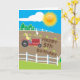 Tarjeta de cumpleaños para niños con arte gráfico de colores brillantes de un granjero en su tractor cuidando de su granja en un día soleado. Personalizado con el nombre de su hijo en el tractor y Feliz Cumpleaños en el campo recién arado.