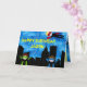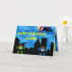 Superhéroes en el suelo y volando en una ciudad empapada de lluvia con rascacielos levantándose a la distancia... Perfecto para ese super héroe de cumpleaños.