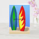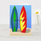 Tarjeta de cumpleaños feliz con diseño fresco de dos tablas de surf de colores vivos en una playa. Estas tablas de surf son de estilo clásico retro y recuerdan a un verano brillante, un día soleado en la playa. Un gran diseño para los amantes de la playa y del surf.