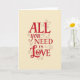 This greeting card shares a warm message with a mix of bold lettering and gentle detail. Centered on a soft cream background, the words “ALL you NEED IS LOVE” stand out clearly. “ALL” and “NEED” are written in strong red block letters that give the message weight and confidence. The words “you” and “IS” are shown in a thinner, flowing script, adding a more personal feel. Across the lower half, the word “Love” appears larger in red cursive, drawing the eye right away. A small red heart replaces the “o,” and delicate red swirls frame parts of the text. It’s a thoughtful card for sharing affection