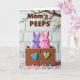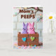 This card shows a close-up scene of two bunny-shaped sweets in soft lavender and pink, sitting close together as if sharing a quiet, friendly moment 🐰. Each bunny has tiny dark eyes and a small V-shaped mouth, giving them a gentle, bashful look. They rest inside a small terracotta-colored container with a brick-like texture that adds a cozy, rustic touch. On the front of the container, two heart accents—one teal and one lime green—sit side by side like a little sign of affection. Soft, diffused light brings out the fine sugar-like texture on the bunnies and a slight shine on the hearts. Small confetti pieces in matching pastel tones scatter across the lower area, adding a light party feel 🌷. In the upper portion, the greeting text appears in a simple pastel tone, centered and easy to read. Behind everything is a softly blurred white brick wall with thin branches and tiny out-of-focus lights glowing in gentle colors.