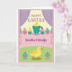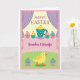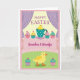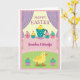 Designed with soft spring pastels, the front shows a cozy dessert-table scene framed by light purple drapes over a sunny yellow, lightly striped background 🌷. Near the top center, a round yellow chick peeks out of a teal teacup dotted with small white spots, as if sharing a shy, friendly glance with whoever is holding the card. Around the cup sit several small frosted cakes in pink, pale yellow, and aqua, each topped with a tiny red fruit and sparkling sprinkles on a pink-and-white checkered surface. A wide pink banner runs across the middle, carrying an affectionate message in darker pink lettering, centered and easy to spot. Below the banner, the setting shifts to a soft green field with faint dot patterns, giving the scene a gentle picnic feel 🐰. In the lower area, another small yellow chick stands facing slightly to the side, its orange feet planted as though it’s waiting for a companion to step closer. Two more mini cakes sit nearby, and the teal cup above has a curved handle with white polka dots catching the light.