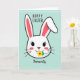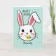 This card features the head of a friendly bunny-like character centered on a pale teal background with a faint grid pattern, outlined by a thin white border 🐰. Two long white ears rise evenly upward, each with a soft pink inner section that adds a gentle, affectionate touch. The face is simple and sweet, with large black eyes and tiny lashes that give it a tender, attentive look, as if it’s gazing at someone special. Light pink blush circles sit on the cheeks, and a small pink nose rests neatly above a tiny mouth. A small yellow flower with a red center and a green stem is held between its lips, like a shy offering to a close friend or partner 🌷. A short greeting appears above the character in a dark, flowing style, while a single affectionate word sits below in matching lettering. The pale teal grid background stays soft and even behind the centered bunny face and the thin white frame.