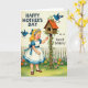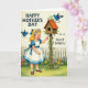 This design shows a retro-style scene centered on a young girl with golden curls and a flower crown, her rosy cheeks turned toward a small wooden birdhouse as if sharing a gentle secret ❤️. She wears a white dress with bright blue trim and bows, and her outstretched hand adds a sweet, friendly closeness to the moment. The birdhouse has a warm terracotta-colored roof and is wrapped with green ivy, making the setting feel cozy and cared for. Two blue birds bring a hint of romance and companionship—one perched on top as if waiting, the other nearby as if listening. Behind them, a white picket fence runs across the background, framing a garden packed with fuchsia, orange, yellow, and lavender flowers 🌼. The message “HAPPY MOTHER’S DAY to a Swell Sister!” appears integrated into the artwork, with the main line larger and the rest smaller beneath it in matching tones. The foreground is a rich green lawn sprinkled with blossoms, and the birdhouse sits slightly to one side with the birds highlighted in bright blue. Share your Mother’s Day sentiments with love and care.