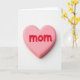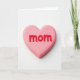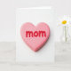 This card features a single heart-shaped candy centered on a bright white background, giving it lots of open space and a calm, intimate feel. The heart is a soft rose-pink with rounded edges, like something sweet you’d want to hold close, and it carries a gentle, affectionate tone ❤️. A light gloss on the surface catches the light in small highlights, adding depth while keeping the look smooth and tender. Across the front of the heart, raised red letters spell “mom,” standing out clearly with a friendly, slightly imperfect look that feels human and caring. The word sits right in the middle of the candy, with the pink heart acting like a quiet frame around it. Soft, even lighting keeps shadows minimal, so the focus stays on the warm contrast between pink and red, like a simple gift shared between close family 🌼. Beneath the heart, a faint sprinkle of tiny sugar-like specks rests on the white surface.