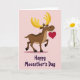 This design shows a sturdy brown antlered animal centered on a soft blush-pink background, stepping forward with one front leg lifted as if approaching someone it likes. Its golden-yellow antlers spread wide above its head, and its big eyes and small upturned mouth give it a friendly, affectionate look ❤️. In its mouth, it carries a heart-shaped bouquet of deep red roses, the green stem angled gently to one side like an offering meant for a dear friend. The simple setting keeps the focus on that tender gesture, as if the animal is delivering flowers on a special day 🌼. Beneath the figure, a short greeting appears in purple lettering, placed low and centered under the hooves. The words read “Happy Moosether’s Day,” with the text standing out clearly against the pink space. The roses are clustered into a heart shape, with layered red petals and a single green stem trailing down from the animal’s mouth.