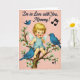 This card features a vintage-style illustration of a winged baby with golden curls, bright blue eyes, and rosy cheeks, seated on a twisting branch dotted with white blossoms and green leaves. The baby wears a pale blue one-piece outfit and smiles as if sharing a secret with someone close, adding a gentle, affectionate tone ❤️. Three small blue birds gather nearby—two perched on the branch and one gliding above—leaning in as though they’re joining the baby’s message like close friends. The background is a soft dusty-rose color that keeps the scene calm and tender. Near the upper area, the text reads “I’m in Love with You, Mommy!” in a flowing dark ink that stands out clearly against the pink. A couple of tiny musical notes sit beside the words, suggesting a sweet little tune 🌼. The branch curves across the lower half of the design, with clusters of white petals and leaves framing the baby and birds.