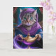A greeting card with a grey Tabby genie who has emerged from a lamp.