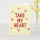 This card features the phrase “TAKE MY HEART” in deep cranberry red, written in a loose brush-letter style that feels honest and a little imperfect. The words sit large in the center, so the message is the first thing you notice. Behind it is a pale yellow background that looks like soft morning light and gives the whole card a gentle glow. Around the text are eight blush-pink hearts, scattered in different sizes like they’re lightly floating. The hearts are simple and rounded, adding a sweet touch without taking attention away from the message. It feels meaningful because it says what you might be shy to say out loud, in a direct and caring way 🥰. This is a lovely choice for a partner, a crush, or even a close friend you want to remind that you care ❤️. Hope it helps you share Valentine’s Day feelings with someone special.