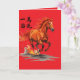A vivid, high-energy illustration: a powerful chestnut horse bolts forward, every muscle taut and lit with warm highlights. A mix of orange and red, and the mane and tail are rendered like streaks of flame, tossing wildly and amplifying the sense of speed.