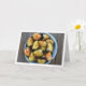 Tazón de fruta de ciruela en rodajas en mesa de madera Tarjeta de felicitación. Puede personalizar fácilmente este producto de forma gratuita si desea agregar texto o cambiar el color del fondo.