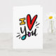 ©2019, diseño dibujado a mano por Dio Perez. La tarjeta es brillante y llamativa. No solo dice te amo, sino que lo dice con mucho color y entusiasmo.