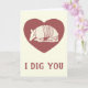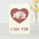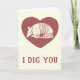Esta linda tarjeta el día de San Valentín muestra un ilustracion de un armadillo en crema o marfil contra un corazón rojo arándano con el mensaje "I Dig You" abajo y el mensaje "Happy Valentine Day" dentro. Esta simple tarjeta es perfecta para regalar a tu novio o marido o a cualquiera que ame armadillos.