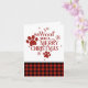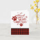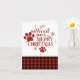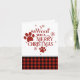 Huella de perro adorable y la frase "te queremos un Feliz Navidad" con un poco de cuadros rojos y negros.