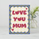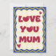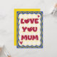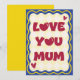 Una tarjeta de felicitación audaz y alegre que presenta el mensaje “TE QUIERO MAMÁ” en letras rojas juguetonas, sobre un suave fondo estampado y enmarcado con un vibrante borde decorativo azul y amarillo. Pequeños acentos en forma de corazón añaden un toque cálido y cariñoso, lo que hace que este diseño sea perfecto para expresar amor y aprecio por Mamá.