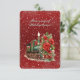 La manera más apropiada de enviar saludos de Navidad a tus amigos y familia. Un fondo rojo de copo de nieve con una cubierta de nieve en caída y un motor vintage de tren con un frente de flores rojas. Marco claro donde se puede cambiar el color
