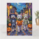 Los Adorables Territorios Blancos de West Highland vestidos con juguetones disfraces de Halloween llevan baldes de calabaza mientras truco o truco bajo el cielo iluminado por la luna. Este diseño festivo resalta el blanquecino abrigo de la raza, los ojos brillantes y la personalidad animada, capturando a la perfección la atmósfera espeluznante y divertida de la noche de Halloween. Una alegre celebración para los fans de Westie, amantes del perro y entusiastas de Halloween por igual.