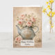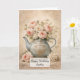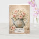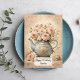 Una suave ilustración de estilo vintage que presenta una tetera clásica llena de rosas rosadas y blancas floreciendo. La composición está situada sobre un fondo envejecido y texturizado con detalles de encaje, creando un delicado y atemporal arreglo floral con una estética shabby chic.
