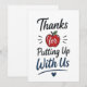 A fun and relatable teacher appreciation design featuring “Thanks for Putting Up With Us.” This lighthearted message reflects the everyday classroom experience in a humorous and honest way. Perfect for students who want to say thank you with a smile, this design creates a memorable and engaging gift.