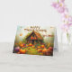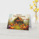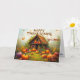 Celebrate Thanksgiving with this imaginative and festive greeting card. The artwork is painted in an impressionist oil style, depicting a whimsical little house built entirely from fruits and vegetables—pumpkins, eggplants, cucumbers, tomatoes, corn, apples, pears, peaches, cherries, and fresh greens—nestled among grass and flowers. The vivid colors, crisp detail, and painterly textures bring the scene to life. Across the sky, bold calligraphy spells out “HAPPY THANKSGIVING,” making this card perfect for sending warm holiday wishes. A delightful choice for friends, family, or anyone who appreciates creative and joyful holiday art.