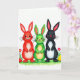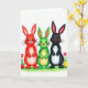 This card shows three stylized bunny figures standing close together on a white background, their gentle smiles and shared glance suggesting easy friendship 🐰. The left bunny is deep red with soft pink inside tall ears and a light cream belly, while the middle bunny is fresh green with pale green inner ears and a golden-yellow belly patch. The third bunny is jet black with red ear linings and a bright white belly, creating a striking contrast beside the brighter pair 🐇. Each has simple dark eyes, a small reddish nose, fine whiskers, and an upward-curving mouth that feels like a quiet, affectionate grin. Below them, a band of bright green grass stretches across the bottom, dotted with small fuchsia and yellow flowers 🌷. Two smooth egg shapes sit tucked in the grass, one red and one golden, adding a festive touch without crowding the scene. A short Easter greeting appears centered near the top in a soft, medium-weight font, set in a dark tone that stands out clearly against the white space. The grass has scattered lighter green speckles, with the tiny flowers and eggs nestled between the blades.