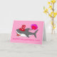Tarjeta de felicitación con lindo tiburón del día de San Valentín que lleva un sombrero rojo de copa con corazones pequeños y globos rojos y rosados. El texto dice "Feliz día de San Valentín". El diseño es personalizable y puedes personalizar el texto.
