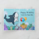 Cuenta con una hermosa escena personalizado de playa en la parte delantera, junto con su propia foto personalizado y texto personalizado en el interior. En la parte delantera, encontrarás una playa de arena con olas estremecedoras y un cielo azul por encima. En la parte superior está la foto de tu personalizado con un borde blanco o un marco a su alrededor, haciéndola aparecer de fondo azul. En la parte inferior, se ve un castillo de arena con banderas azules y fue diseñado por Terdpongvector en la página web de freepik.com. Les agradezco por permitirme usarla dentro de mi diseño. Al lado, habrá dos ilustraciones personalizados de tiburones, uno a ambos lados del castillo, y ambos están fuera del agua, parados erguidos en sus aletas de cola. El de la izquierda es un gris oscuro azul y azul claro y parece que está construyendo el castillo de arena, y el de la derecha es gris oscuro con una gran sonrisa teética. Él sostiene tres globos, morado, azul y amarillo, y encima de su cabeza tiene un gorra de la fiesta de cumpleaños de cono que está rayado de amarillo y verde. En el interior, hay otro tiburón, este mucho más grande, y parece estar nadando en el océano. Tiene su mes abierto, y puedes ver sus dientes, y parece que está sonriendo y diciendo Feliz Cumpleaños, y luego verás texto personalizado bajo el texto de feliz cumpleaños, aquí escribirás el nombre de quien sea para quien sea esta tarjeta. Alrededor de este gran tiburón, hay un fondo azul claro con burbujas de aire a su alrededor, y en el fondo está el fondo marino. Es muy colorido, en tonos violeta, verde, amarillo y azul. Sentarse en el suelo del océano es un regalo envuelto en papel de envoltura naranja con manchas naranjas claras y cinta verde y arco encima. Detrás del regalo hay tres globos más, en rojo, azul y amarillo.
