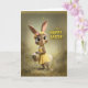 Celebra la alegría de la primavera con esta adorable tarjeta de felicitación de Pascua que presenta a un dulce conejo con un vestido amarillo soleado y corona de flores, sosteniendo una cesta llena de huevos de Pascua coloridos. Rodeado de una suave luz dorada y mariposas revoloteando, este diseño caprichoso captura la calidez, la felicidad y la renovación de la temporada de Pascua. Una tarjeta encantadora para enviar deseos festivos de Pascua a amigos, familiares o cualquier persona que ame el arte de conejitos lindos y escenas primaverales alegres.
