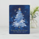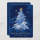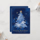 Envíe elegantes saludos de vacaciones con esta impresionante tarjeta de Navidades azul marino con un árbol navideño de acuarela envuelto en cinta dorada y coronado con una estrella dorada. Rodeado de delicados copos de nieve dorados sobre un fondo azul profundo, este diseño exuberante de elegancia invernal refinada. Perfecto para enviar cálidos deseos de vacaciones de una persona, pareja o familia que ama los diseños atemporales y elegantes de Navidades.