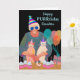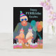 Feliz PURRcumpleaños, tarjeta de felicitación de papel que presenta una colorida ilustración de fiesta de cumpleaños de un gato con una señora mayor y dos gatos en modo de fiesta. Los gatos llevan sombreros de fiesta, al igual que la señora, que también lleva gafas de sol azules oscuras. Una fila de cupcakes con velas de cumpleaños están en la mesa. Los globos y un regalo también están en el diseño. Arte, imagen y verso copyright © Shoaff Ballanger Studios, 2023.