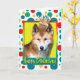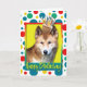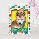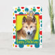 Celebra un cumpleaños con esta fantástica tarjeta de saludo de perro de Dingo. Con una torta balanceada en la cabeza, el diseño hará sonreír y reír. BTW, Este diseño tiene varias versiones, con diferentes colores de fondo. También hay una invitación a una versión Fiesta.