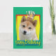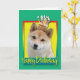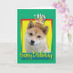 Celebra un cumpleaños con esta extravagante tarjeta de saludo de Perro Shiba Inu. Con una torta balanceada en la cabeza, el diseño hará sonreír y reír. BTW, Este diseño tiene varias versiones, con diferentes colores de fondo. También hay una invitación a una versión Fiesta.