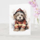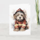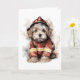 Un adorable perro con traje y sombrero de bombero en esta tarjeta de felicitación en blanco.