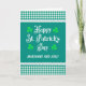 Una tarjeta de felicitación bonita y de estilo campestre para el Día de San Patricio para personalizar con un nombre o nombres en la portada, con paneles de gingham a cuadros verdes y blancos en la parte superior e inferior, bordeados con encaje falso blanco. La felicitación de la portada es "Feliz Día de San Patricio" en letras blancas de estilo antiguo sobre fondo verde oscuro con cuatro hojas de trébol de color verde más claro en las cuatro esquinas y espacio debajo para que puedas agregar el/los nombre/s del/de los destinatario/s en letras mayúsculas blancas debajo. El mensaje interior es solo una sugerencia y puedes cambiarlo o eliminarlo fácilmente si lo deseas.