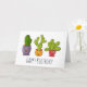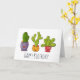 Tarjeta de cumpleaños con un ilustracion caprichoso con 3 pequeños cactus felices sentados en sus propias macetas de flores. Cada uno tiene sus propias expresiones únicas sonriendo y luciendo feliz.