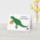 Una tarjeta de dinosaurio T-rex Halloween para niños. El frente presenta un rex de tiranosaurio sosteniendo una calabaza y una araña se cuelga alegremente de su cola. El mensaje dentro de Halloween se puede personalizar fácilmente. Esta tarjeta t-rex de Halloween es genial para los amantes de los dinosaurios.