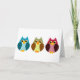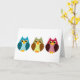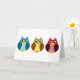 Agrupación de búhos en tres llamativos tonos de joyas: azul, verde oliva y magenta profundo.