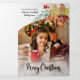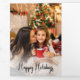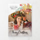 Rasgos coloridos y festivos de hojas de otoño y verdor de invierno y bayas con caligrafía personalizado Feliz saludo de Navidad y plantilla de foto curvada con campos de texto editables.