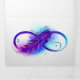 Símbolo infinito con una hermosa pluma pintada de color violeta y azul brillante sobre fondo blanco.