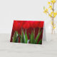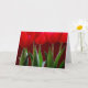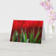 Tarjeta con tulipanes rojos brillantes sobre fondo rojo oscuro