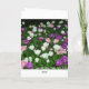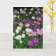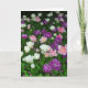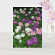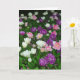 Una tarjeta con una foto de tulipanes en blanco, rosa y morado, intercalados con otras flores y hojas pequeñas. El interior de la tarjeta se ha dejado en blanco, que se puede personalizar más o dejar en blanco para escribir un mensaje personal.