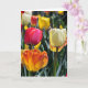Los tulipanes coloridos son iluminados por el sol de la última hora de la tarde. Observe que esta tarjeta se puede modificar para requisitos particulares con su propia inscripción personal.