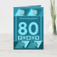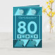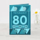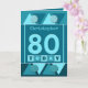 80.ª tarjeta de felicitación de cumpleaños. 80 hoy, agrega un nombre y escribe tu mensaje dentro. Turquesa y azul con formas de tapón y triángulos de botella. Cumpleaños.