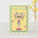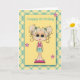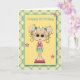 Envíe deseos de cumpleaños a un chica especial de cumpleaños con este chica lindo y a la moda con ojos de perro grandes y cruces rubios sobre fondo de puntos de polka amarillo con borde de manto amarillo y turquesa. (Algunos gráficos ©Trina Clark en digiwebstudio)