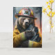 Un oso con equipo de bomberos se encuentra entre un incendio forestal, abrazando un trozo de madera carbonizada. Se puede cambiar el texto.