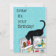 ¡Es tu cumpleaños! Adelante, actúa como si fuera la primera de tus nueve vidas. Un gato negro malvado abre el refrigerador para el sueño, quiero decir crema. Las baldosas turquesa y el contenido detallado del frigorífico añaden encanto y humor a esta tarjeta. Los amigos de su amante del gato tendrán el humor.