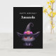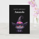 Tarjeta de cumpleaños con un divertido ilustracion temático de Halloween para los amantes del gato. Un gato negro de ojos grandes vestido con el gorra de una gran bruja negra con un cinturón rosado violáceo alrededor del borde.